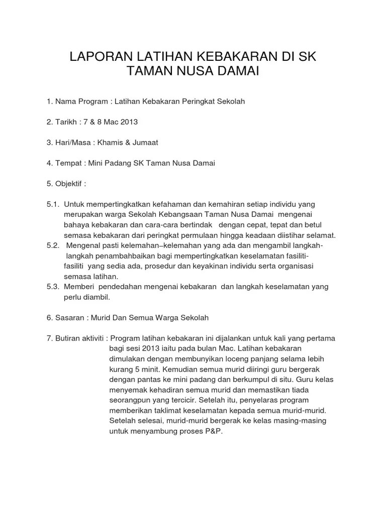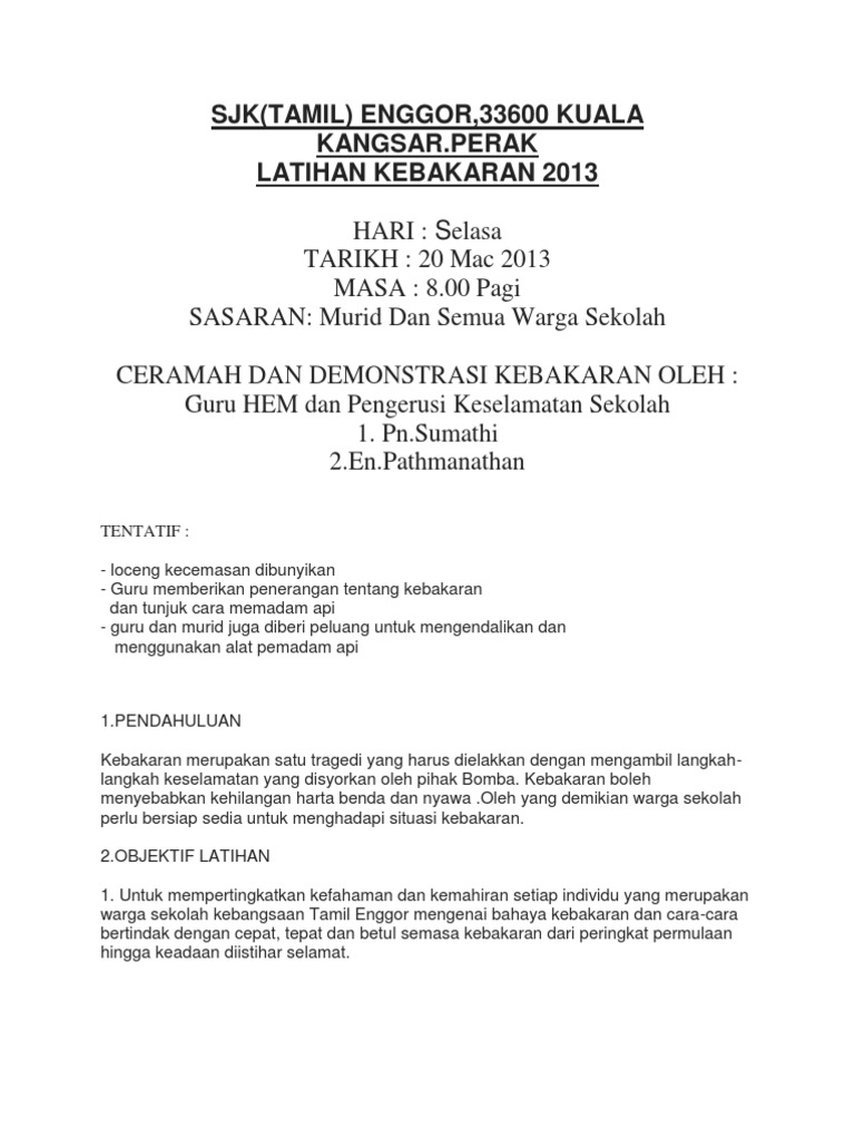 Latihan Kebakaran Sk Subak from img.dokumen.tips Posted by smkdm at 8:55 am. Terjemahan frasa latihan kebakaran dari bahasa indonesia ke bahasa inggris dan contoh penggunaan latihan kebakaran dalam kalimat dengan terjemahannya: Kebakaran hutan/lahan yang terjadi baik antar negara maupun antar provinsi di indonesia bukan spesifik negara, ekosistem, masyarakat. Memadamkan api menggunakan guni basah. Koordinasi dengan instansi yang berwenang atau aparat pemerintah setempat. Kereta bomba yang berharga rm 1.6 juta sebuah. Guru menerangkan tujuan latihan kabakaran. Murid berkumpul di luar bangunan sekolah, iaitu di depan sekolah.