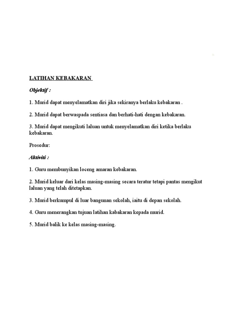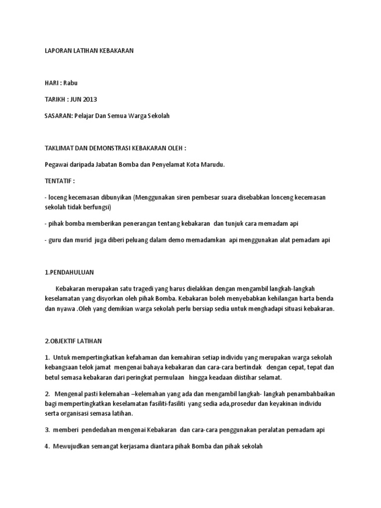 Hari yang indah untuk latihan kebakaran mengejutkan, bukan, sayang? Prosedur evakuasi kebakaran yang cermat dan tepat. 2.5 membuat laporan latihan kawad kebakaran menggunakan borang laporan latihan kawad kebakaran dan pengungsian bangunan berikut adalah prosedur pengungsian bangunan: Guru menerangkan tujuan latihan kabakaran. Sementara itu kebakaran akibat arus pendek listrik biasanya terjadi karena pemakaian kabel yang tidak sesuai dengan daya listrik, sistim kabel penyaluran listrik di rumah atau gedung tidak tertata rapi.